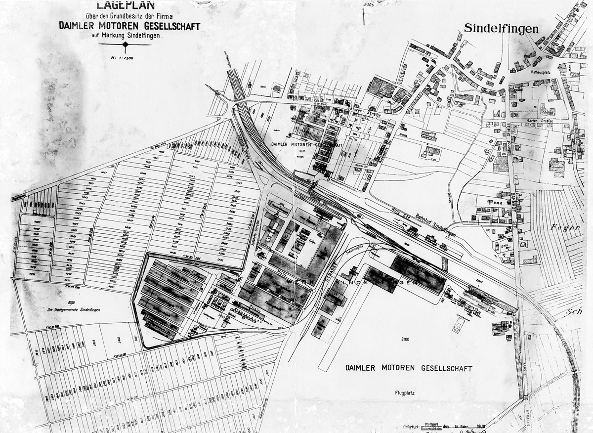 ij de foto: De Daimler-Motoren-Gesellschaft koopt in juli 1915 van de stad Sindelfingen een 38 hectare groot grondstuk aan bij het militaire vliegveld Böblingen om er een vliegtuigfabriek te starten. Deze situatieschets is van 21.2.1919.